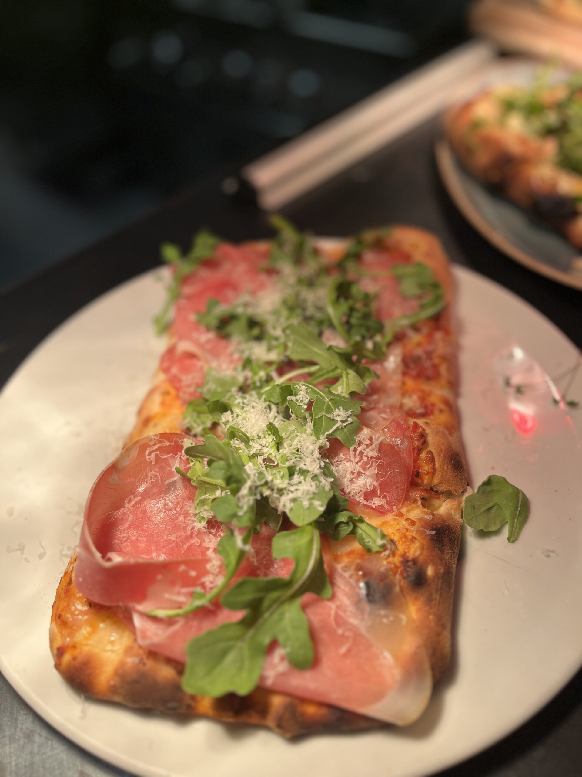 Tomatsås, mozzarella, grana padano, lufttorkad skinka, pesto, ruccola